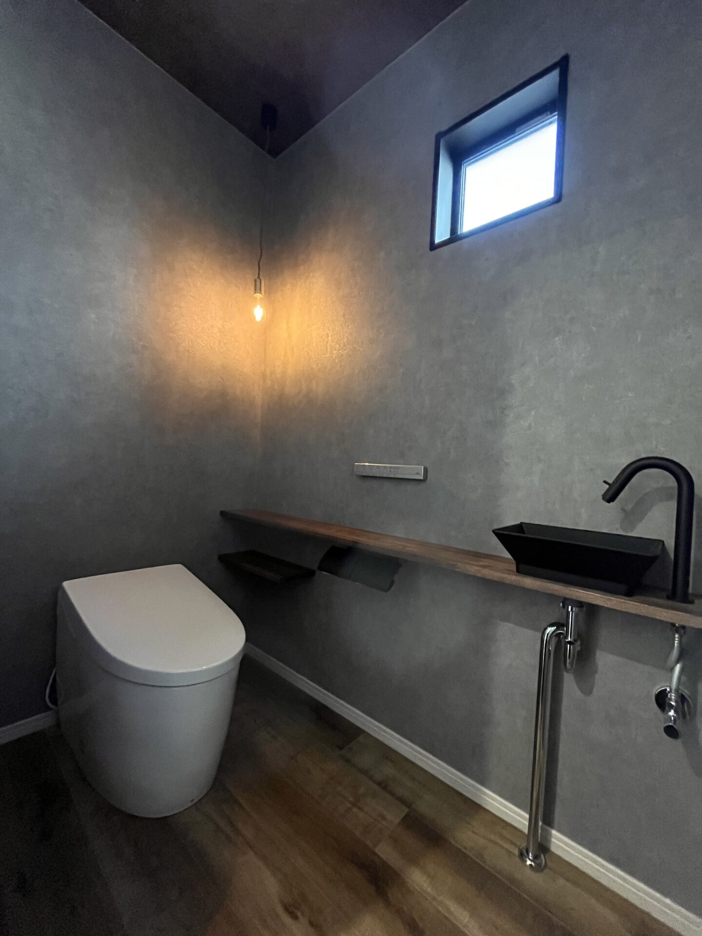 グレーの壁紙に、温かみのあるペンダントライトの灯り…。まるで隠れ家バーのような洗練されたトイレです。