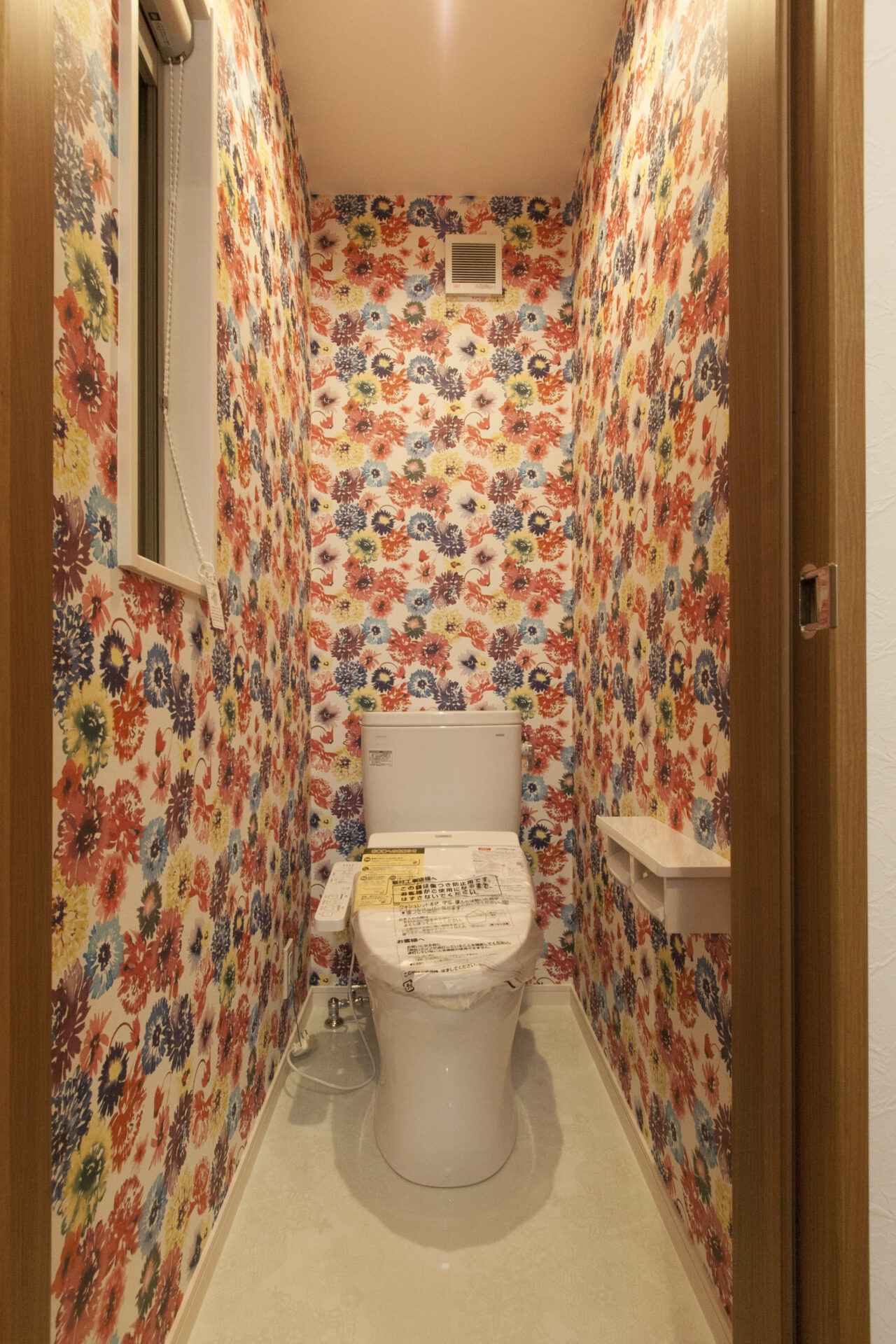 トイレ本体やカウンターをシンプルに白でまとめることで、壁紙の鮮やかさがより一層際立っていますね。